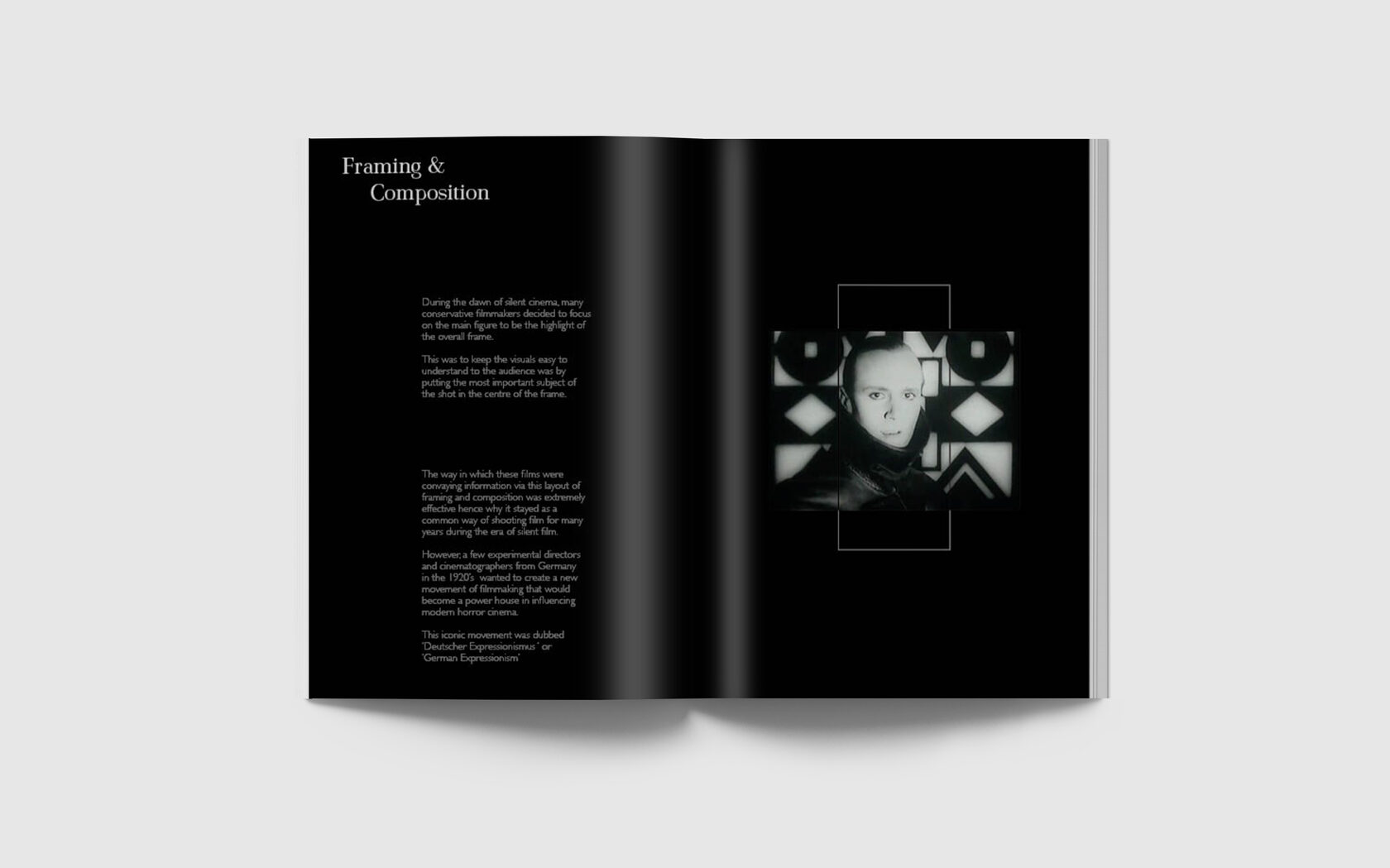 These different variations occurred over the course of several months due to personal and peer reviewed design changed. The front cover designs were all of my own decision, while the decision of which one I'd use was opened up to a group of my peers. The typography change was suggested by my tutor due to the swiss style of font not fitting with the topic. I switched the title type to a Polish typeface called "Antykwa Poltawskiego" and the body type was switched to a typeface by Jan Tschichold called "Uhertype-Standard-Grotesk", both of which were created in parallel to silent cinema.